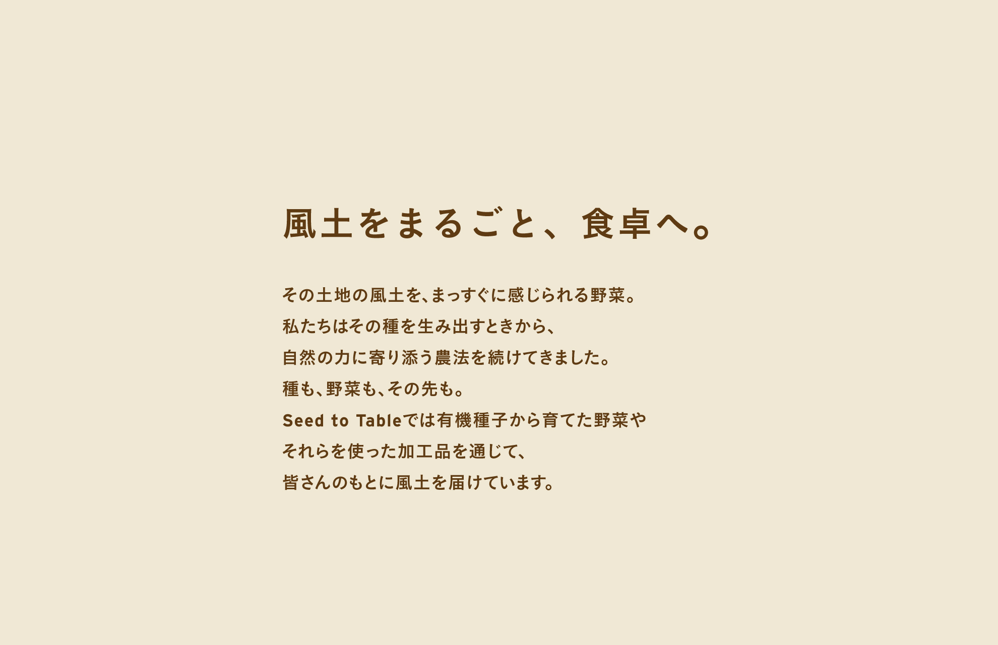 タグライン「風土をまるごと、食卓へ。」には、野菜そのものだけではなく、その土地の土壌や気候、生産者の想い、自然と向き合う時間までも含めて届けたいという願いが込められています。