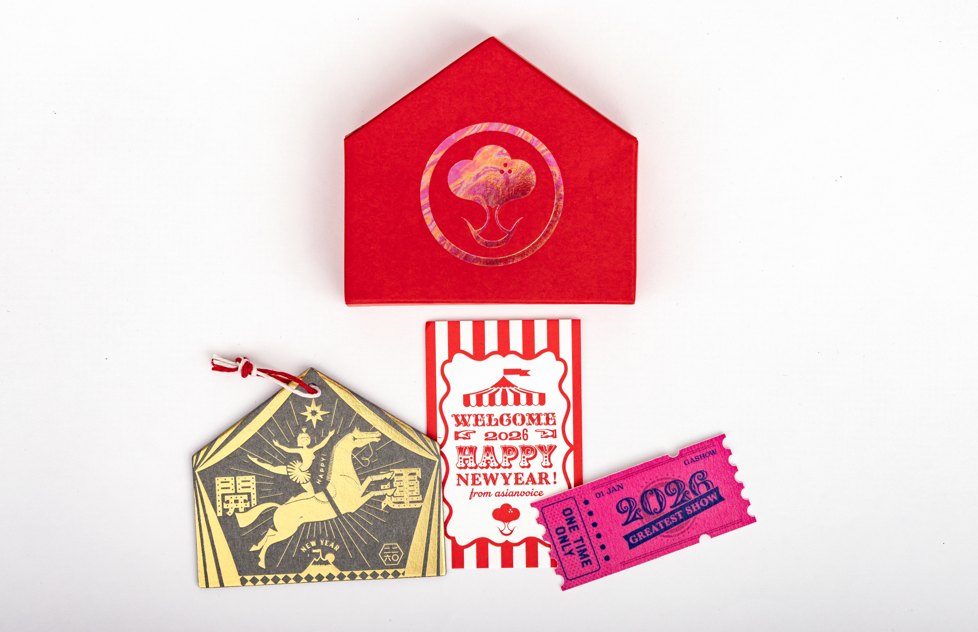 This year’s New Year’s card theme is Circus. It features a votive plaque illustrated with a circus girl riding a horse, along with an invitation card, a one-time-only ticket for 2026, and celebratory candies.